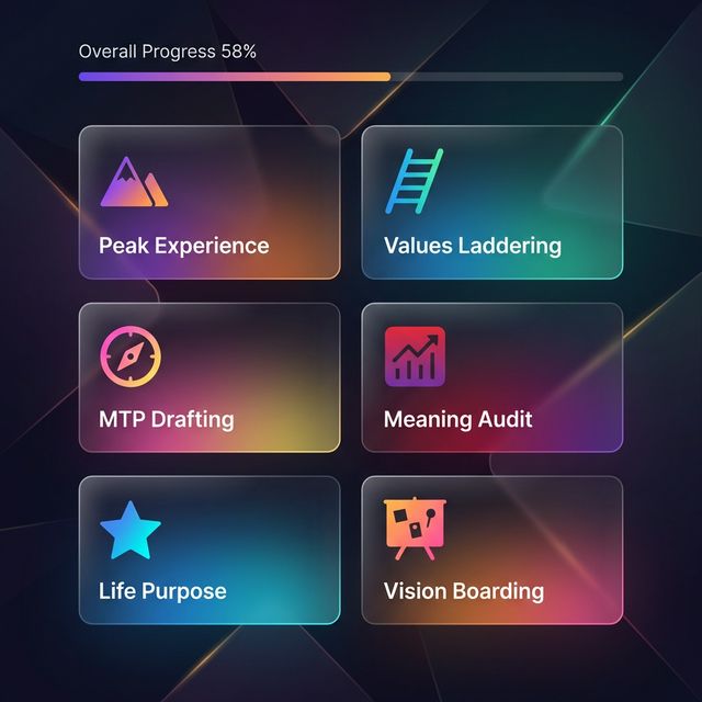 Framed as a set of coaching tools that are progressively unlocked, you can explore different dimensions of what matters to you and how you can create that.